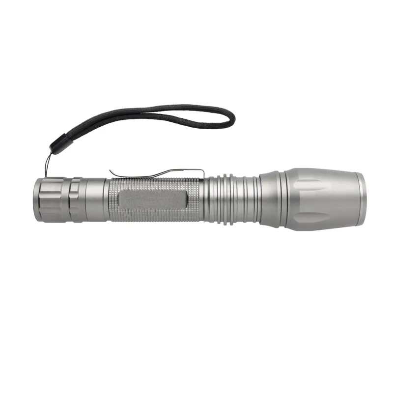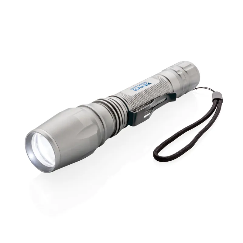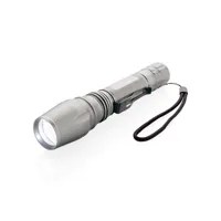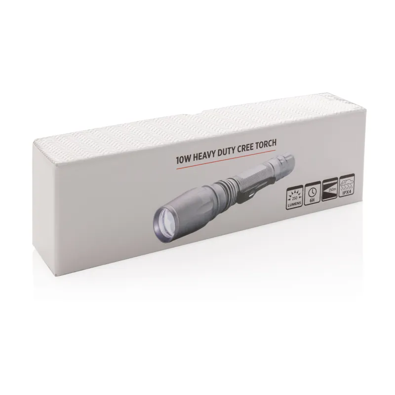 Nagy teherbírású 10W-os CREE led zseblámpa. Az időtálló, 250 lumenes, alumínium lámpa IPX4 vízálló illetve ütésálló 1 méteres esésig. Állítható fénysugárral egy pont vagy nagyobb terület megvilágítására. A csíptető segítségével övre csíptethető. Akár 6 órán keresztül is használható. Az elem tartozéka a terméknek.