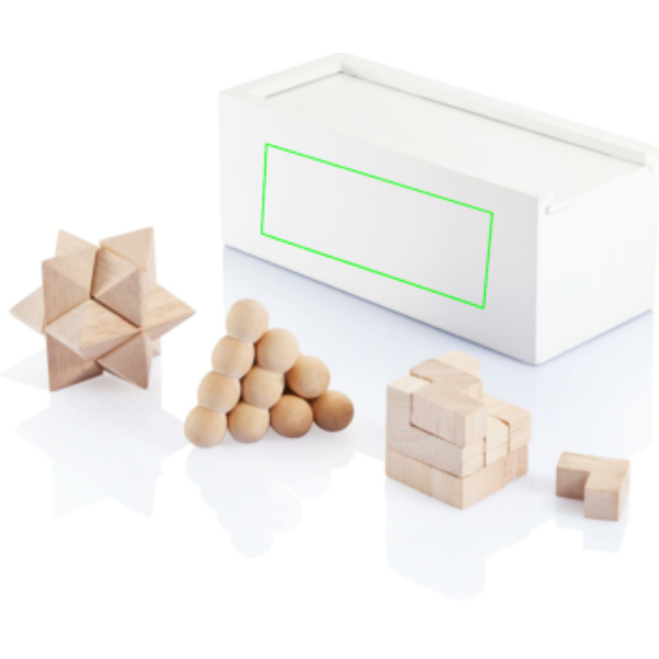 Tornáztassa elméjét! A fejtörő játékok rendkívül szórakoztató módszert kínálnak elemzési és problémamegoldó készségeinek fejlesztésére. Ez a fejtörő készlet 3 rejtvényt tartalmaz és fehérre festett fenyő fadobozban érkezik. FSC® fából készült. FSC® kraft ajándékdobozban.