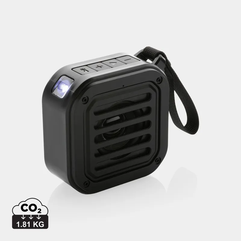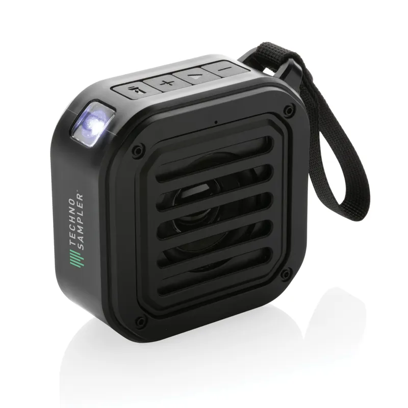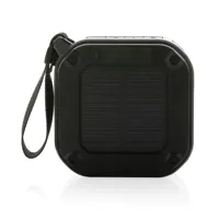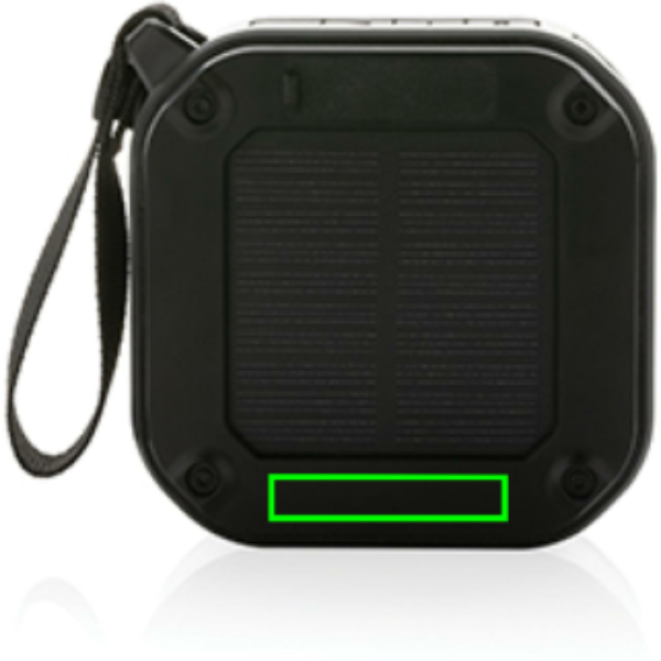 Erőteljes, 3W-os vezeték nélküli hangszóró integrált napelemmel a hátoldalán, RCS újrahasznosított ABS-ből. Teljes újrahasznosított anyag tartalom: 38% a termék összsúlya alapján. Az RCS-tanúsítvány biztosítja az újrahasznosított anyagok ellátási láncát. A hangszóró 19%-os konverziós aránnyal használ kiváló minőségű monokristályos napelemeket. A töltési arány a feltételektől függ. Töltési sebesség napenergia: 5 V/80 mA. 400 mAh-s akkumulátorral amely akár 5 órányi lejátszási időt biztosít és 5.3 vezeték nélküli kapcsolattal a zökkenőmentes csatlakoztatásért és a tiszta hangzásért. Működési távolság akár 10 méter. Mikrofonnal és hívásfogadás funkcióval. Integrált 30 lumenes LED lámpával. FSC mix FSC® dobozban. RCS újrahasznosított TPE töltőkábellel. A termék és tartozékai 100% PVC-mentesek. IPX5 vízállóság.