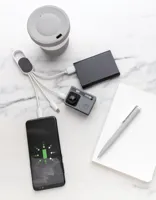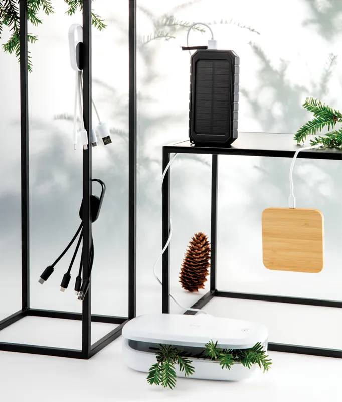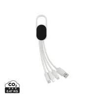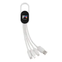 4 az 1-ben kábel karabínerrel. USB bemeneti csatlakozó valamint kimeneti egység: két oldalú csatlakozó IOS készülékekhez, micro USB valamint C-típusú csatlakozó. Alkalmas a legelterjedtebb telefonkészülékek töltésére. ABS burkolattal valamint 10 cm hosszú nejlon, fonott kábellel. Legfeljebb 2.1A-es töltéshez.