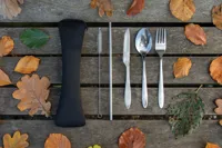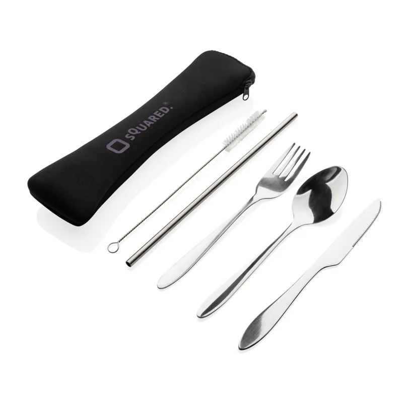 Újrafelhasználható rozsdamentes acél evőeszközkészlet bárhová is megy. A készlet tartalmaz villát, kést, kanalat, szívószálat és kefét mellyel megtisztíthatja a szívószálat. Cipzárral és zsinórral ellátott neoprén tasakban. Mosogatógépben mosható.