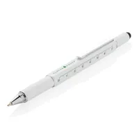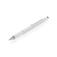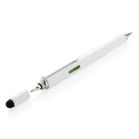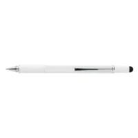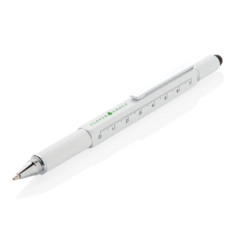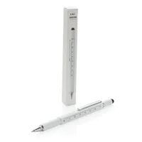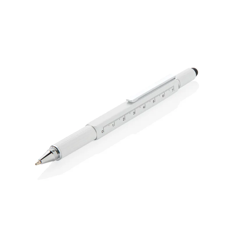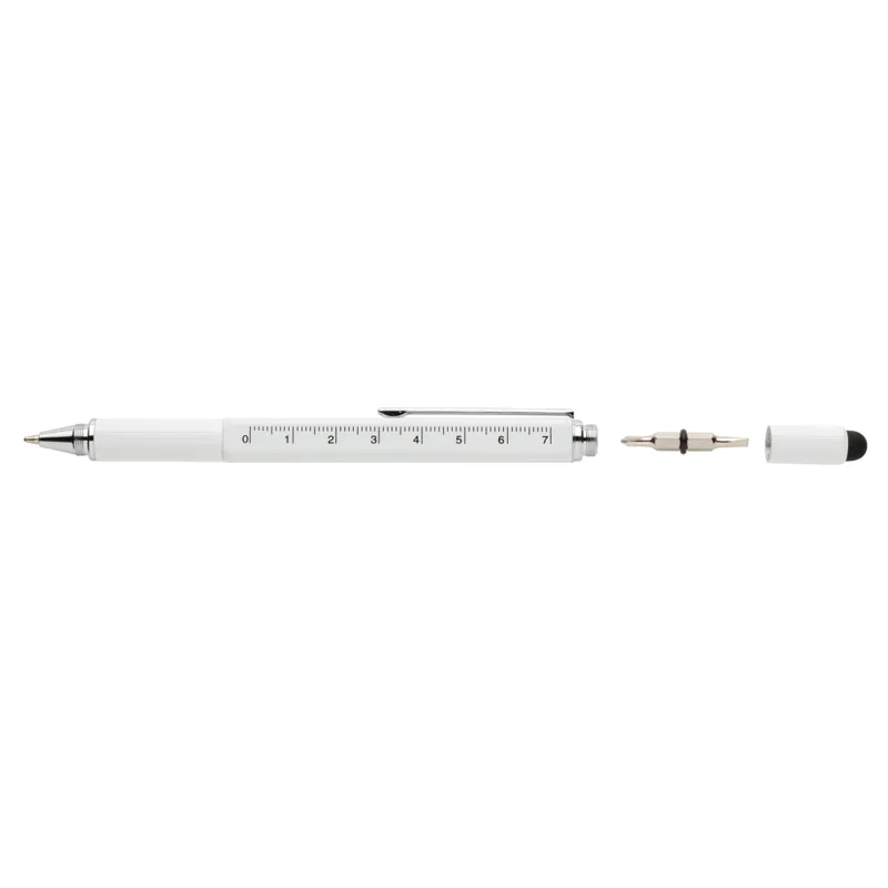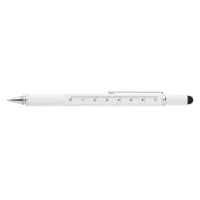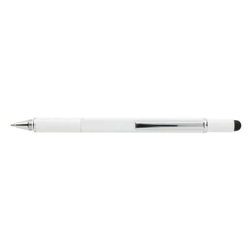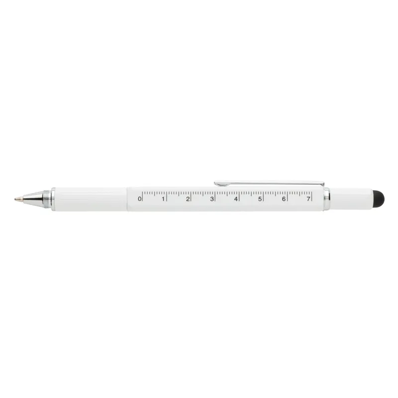 Többfunkciós toll vonalzóval (7 cm), vízmértékkel, csavarhúzóval, érintőtollal és kéken író golyóstollal (akár 400 méter íráshosszal). Sárgarézből alumínium csíptetővel.