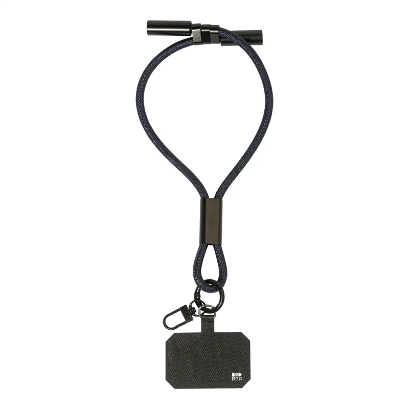 RPET mobiltartós csuklópánt telefonbetéttel, karabinerrel és beépített USB-C - USB-C töltőkábellel, rejtett csatlakozókkal. 60 W-os PD gyorstöltést és adatátvitelt támogat.
