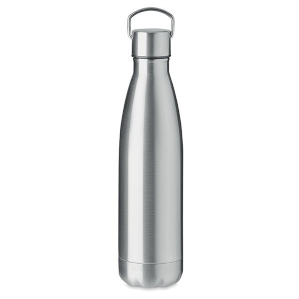 Duplafalú rozsdamentes acél palack, fogantyúval ellátott fedéllel. Szivárgásmentes. Űrtartalom: 500 ml.