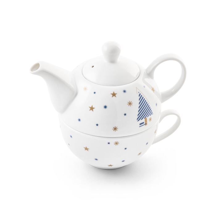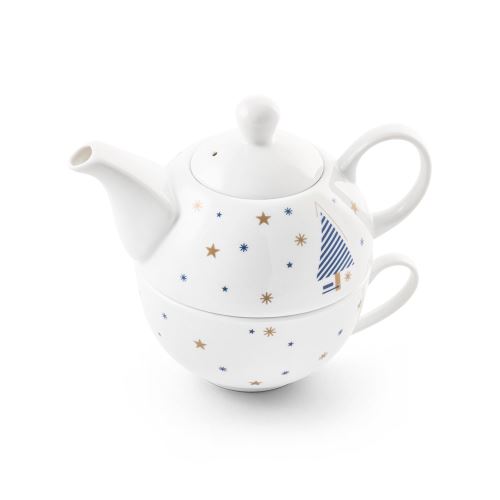Porcelán teáskészlet karácsonyi nyomtatással. A teáskanna kapacitása legfeljebb 430 mL, a csésze kapacitása pedig 220 mL. Kartondobozban szállítjuk. 147 x 113 x 143 mm