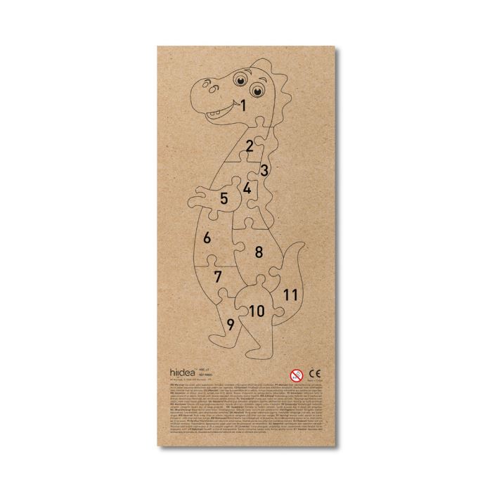 Dinoszaurusz alakú puzzle, rétegelt fenyő lemezből. Minden alkatrész számozva van az összeszereléshez. Az alap, szintén rétegelt lemezből készült, testreszabható. Kraftpapír díszdobozban szállítjuk. Mivel a termék természetes anyagokból készül, a termék színe, valamint a nyomtatás eredménye termékenként eltérő lehet. 128 x 298 mm
