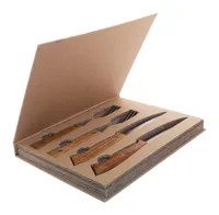 4 db-os rozsdamentes acél steak evőeszközszett akácfa nyéllel (2 steak kés, 2 villa). Kraft papírból...