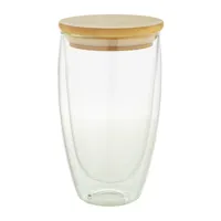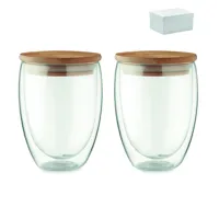 2 db duplafalú, boroszilikát üvegből készült pohárból álló készlet. Bambuszfedéllel, szilikongyűrűve...