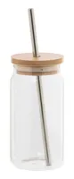 Boroszilikát üvegpohár, bambusz fedéllel és újrahasznosított rozsdamentes acél szívószállal, 450 ml.