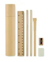 Újrahasznosított hengeres papírdoboz írószerkészlettel. 2 ceruzát, 1 karton tolltestű golyóstollat, ...