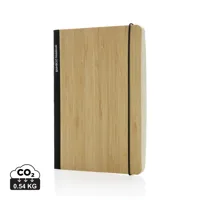 A5 jegyzetfüzet 600D RPET keménytáblás borítóval, bambusz részletekkel, okostelefon állvány funkcióv...