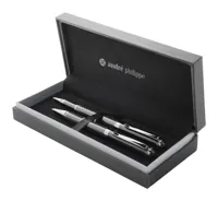 Elegáns, fém golyóstoll és rollertoll szett mintázott testtel. Fekete díszdobozban, kék tollbetéttel...