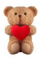 Nagy poliészter plüss mackó piros szívvel a kezében, hímzett szemekkel, orral és szájjal.
