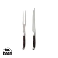Szeletelőkészlet késsel és villával, tipikus francia ihletésű bisztró stílusban. Fekete pakkafa mark...