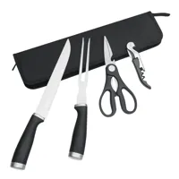 <b>ROASTY rozsdamentes acél hússzeletelő kés szett</b>, 4 részes: szeletelő kés, húsvilla, húsvágó o...
