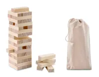 54 elemből álló fatorony játék, pamutvászon tárolózsákkal.