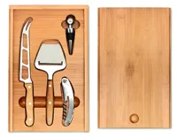 Bambusz sajt- és bor szett. Tartalma: rozsdamentes acél kés, sajtszeletelő, dugóhúzó és palack vissz...