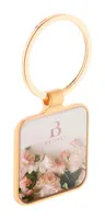Négyzet alakú fém kulcstartó arany kivitelben, fegyverfém lemezzel. Kraft papír dobozban.