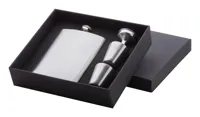 Rozsdamentes acél laposüveg szett tölcsérrel és 2 feles pohárral, 230 ml. Fekete díszdobozban szállí...