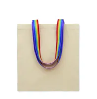 180 g/m² pamut bevásárlótáska szivárványszínű fülekkel. Teherbírás: 2,5 kg.
