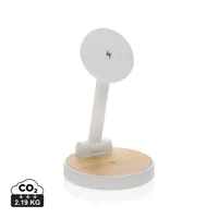 Bambusz, többfunkciós vezeték nélküli gyorstöltő (15W) mobiltartóval és öröknaptárral, fémvázon. USB...