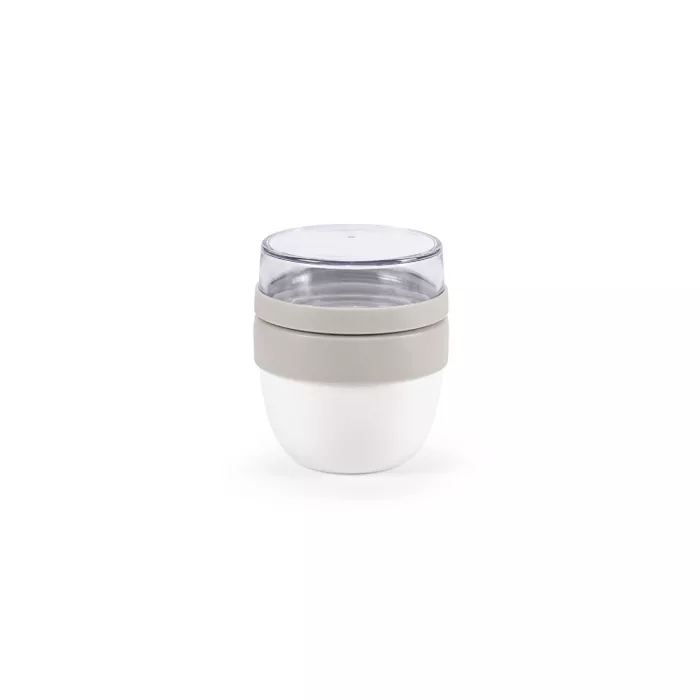 Ez az élelmiszerdoboz egy öko-duett: 350ml (nettó 260ml) újrahasznosított rozsdamentes acél és 230ml (nettó 110ml) műanyag átlátszó fedéllel, hogy beleláthasson. Duplafalú bűbáj, ovális kecsességgel. Nem borul ki semmi, mivel szivárgásmentes. Joghurthoz és müzlihez, tökéletes páros.