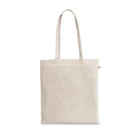 Újrahasznosított pamutból (70%) és poliészterből (30% rPET) (150 g/m²) készült táska, 65 cm-es fogantyúval. Az újrahasznosított pamut egyszínű és festetlen. A nyersanyagot eredeti formájában és színében használják fel, festő- vagy fehérítő vegyszerek használata nélkül, ami hozzájárul a kisebb környezeti hatáshoz. Az egyszínűséget az azonos árnyalatú újrahasznosított fonal kiválasztásával érik el, ezért tökéletlenségek és színváltozatok előfordulhatnak. 380 x 420 mm