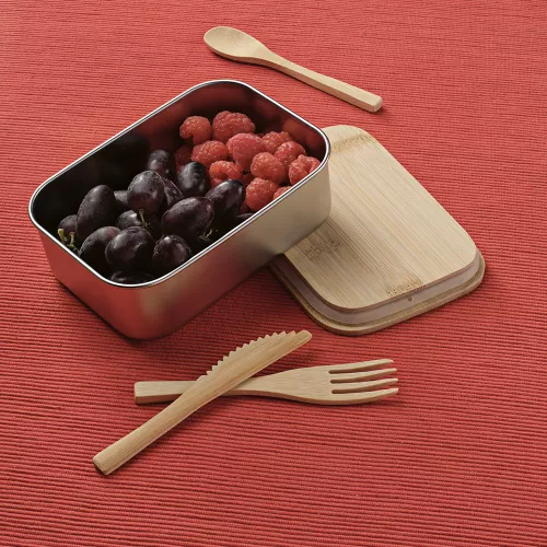 A 740 ml-es (nettó 490 ml) uzsonnásdobozunk újrahasznosított rozsdamentes acélból készült, bambusszal koronázva. Nem kell babrálni a gumival rögzített evőeszközökkel: villát, kést és kanalat tartalmaz. A salátáktól a sushiig, ez mindig az Ön környezetbarát ebédlőtársa útközben.