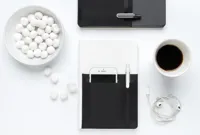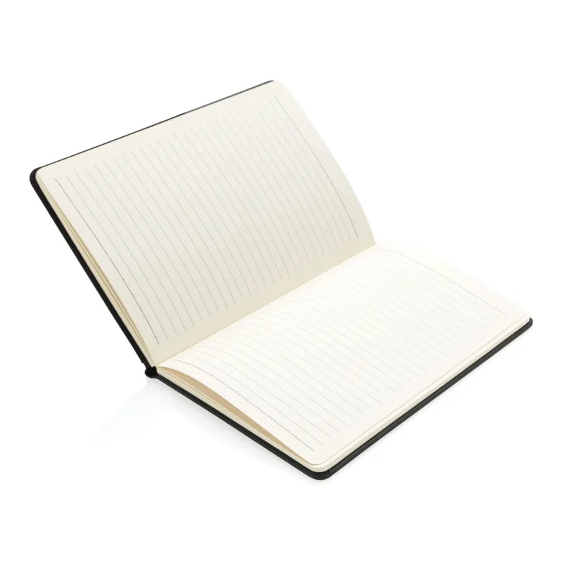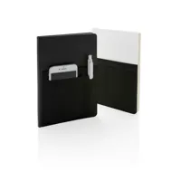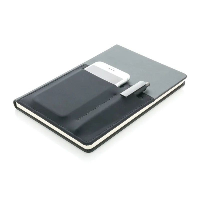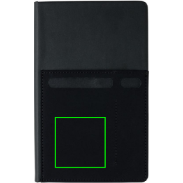 A5-ös méretű jegyzettömb 160 krémszínű, vonalas oldallal (80g/m2). A fedőlapon egy rugalmas telefon-és tolltartó zseb és egy dokumentumoknak szánt nagyobb tok található. A telefontartó zseb 8cm-es. Szélessége megfelel az iPhone 7 plus telefonénak.