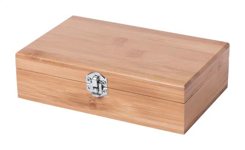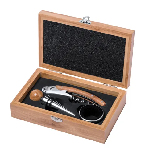 Bambusz boros szett dugóhúzóval, cseppőrrel és záródugóval bambusz dobozban.