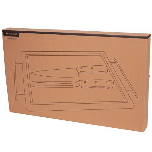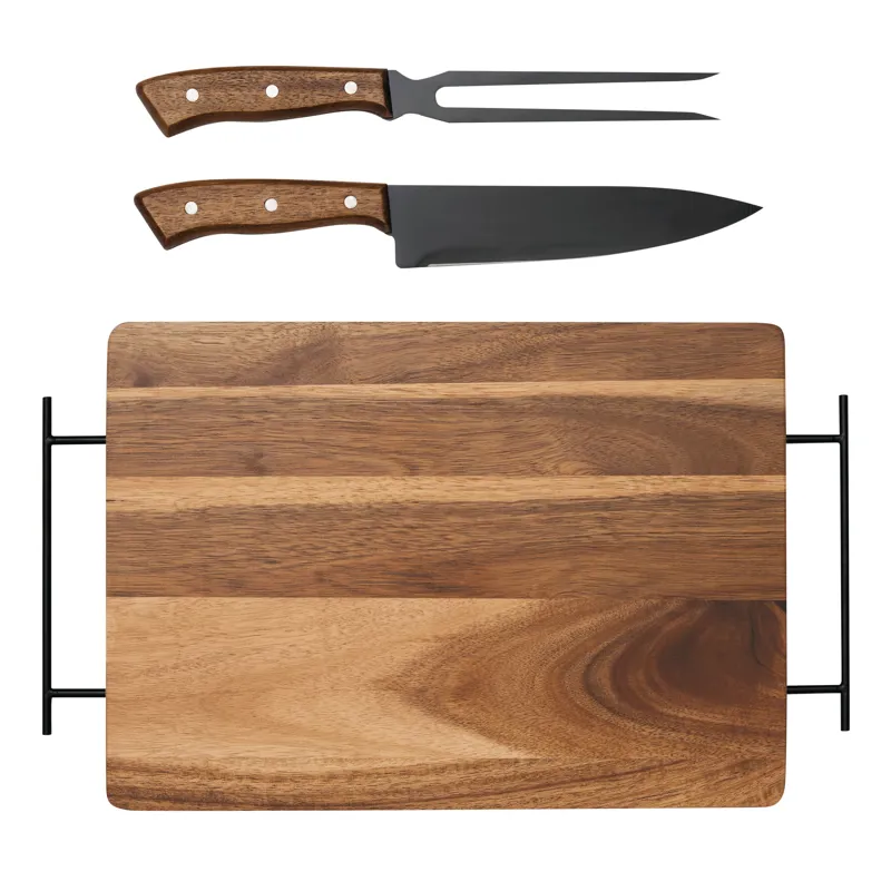 ACACIA CUT vágódeszka: kés és villa rozsdamentes acélból, akácfa nyéllel, praktikus folyadékelvezető mélyedéssel a szélén és fém fülekkel