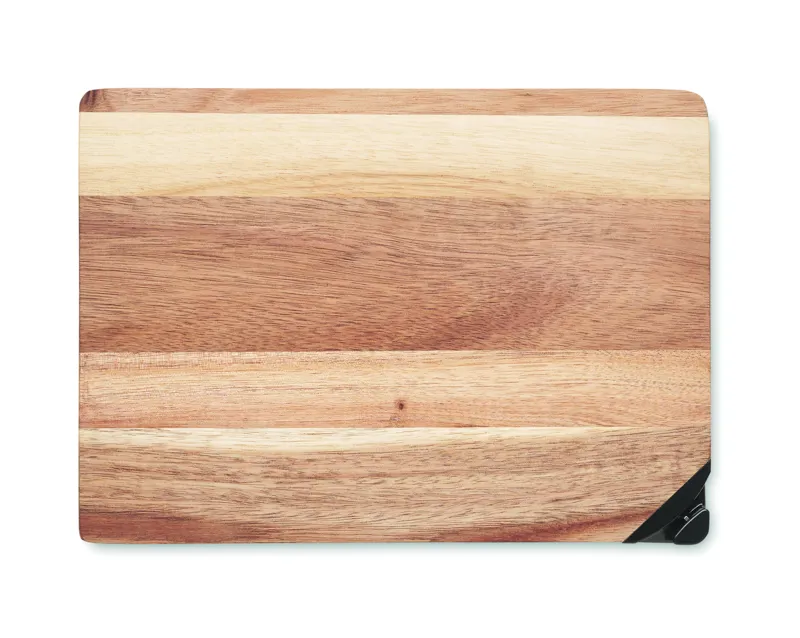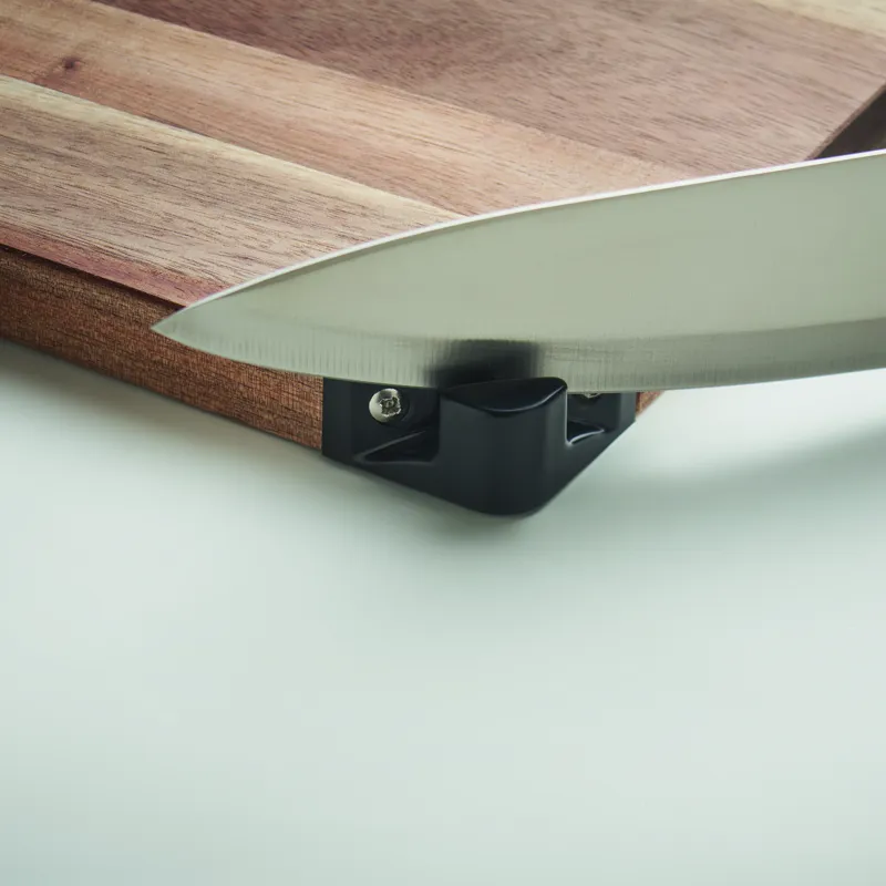 Akáciafa vágódeszka beépített késélezővel. A fa természetes anyag, termékenként szín- és méretbeli eltérések jelentkezhetnek, ami befolyásolhatja a dekoráció végső eredményét.