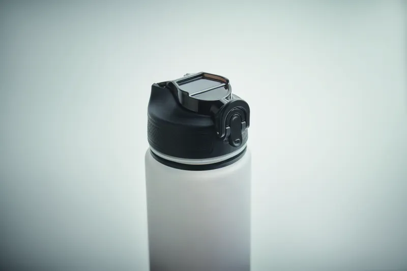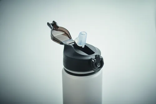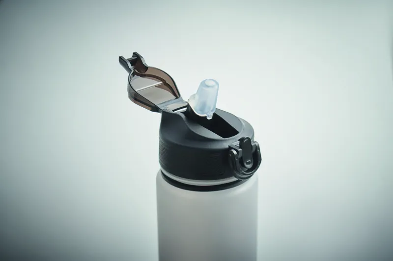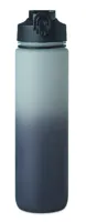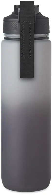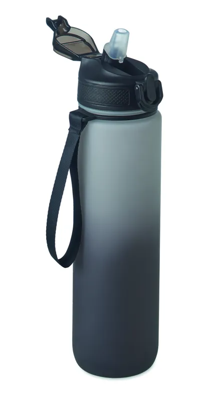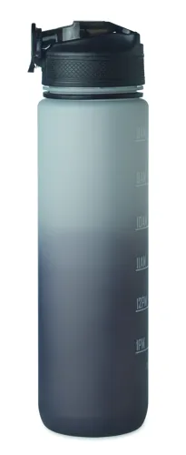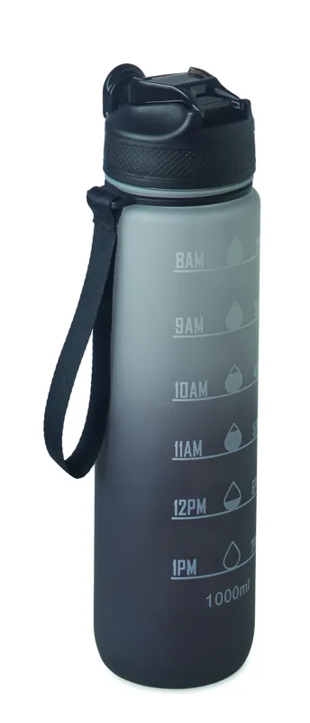 Sportkulacs RPET-ből, beépített szívószállal, puha szilikon ivórésszel, motivációs időjelzéssel, egy kézzel nyitható, felpattintható fedéllel, biztonsági zárral és hordszíjjal. Szivárgásmentes. Űrtartalom: 1 liter.
