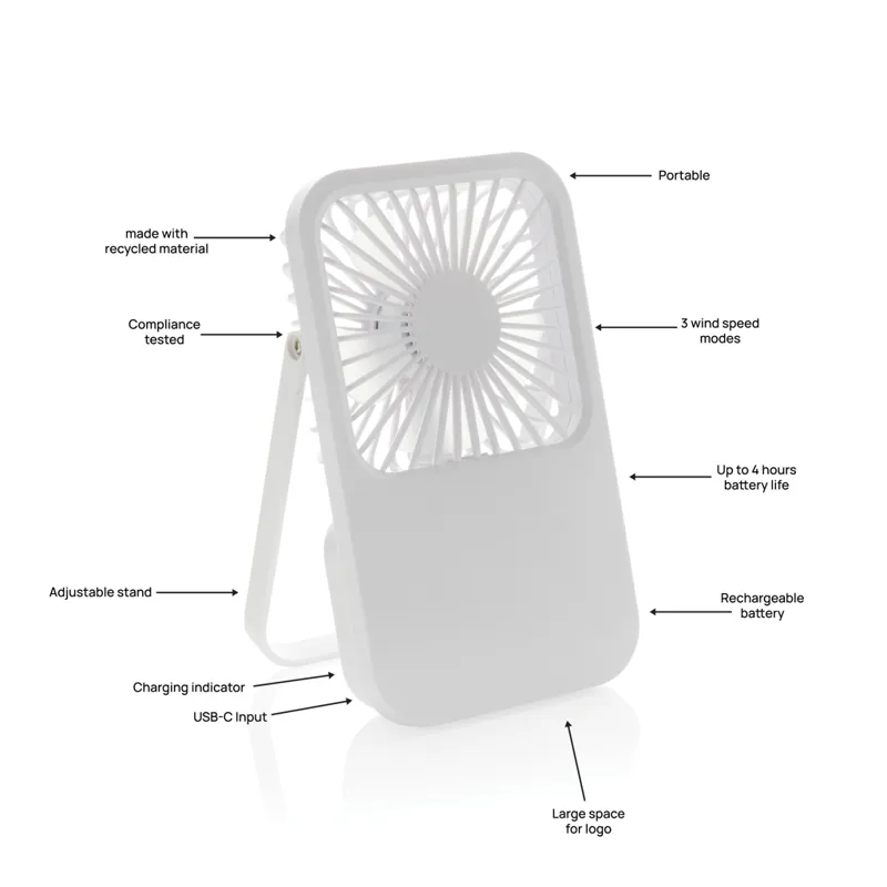 RCS újrahasznosított műanyagból készült, elegáns és praktikus. A modern fekete dizájn a stílust és a funkciót ötvözi. Az újratölthető 1200 mAh-s Li-ion akkumulátor akár 3 óra munkaidőt biztosít, és 4 óra alatt újratölthető a mellékelt 120 cm-es fekete TPE USB-A - USB-C kábellel. Három állítható sebességfokozattal és állítható állvánnyal rugalmas kényelmet biztosít, ahol csak szüksége van rá. RCS újrahasznosított ABS műanyagból készült. Az RCS-tanúsítvány biztosítja az újrahasznosított anyagok ellátási láncát. Teljes újrahasznosított anyagtartalom: 58% a termék összsúlya alapján. PVC-mentes. FSC® kraft dobozban. Max. teljesítmény: 5 W | Bemeneti áramerősség: 5 V / 400 mA.