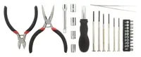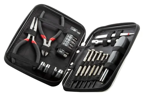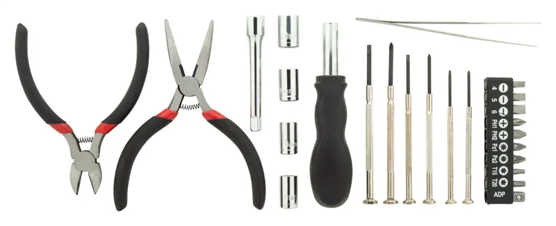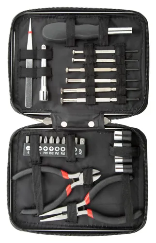 25 darabos fém kulcskészlet cipzáras alumínium tokban. A szett tartalmaz orrfogókat, oldalcsípőfogókat, hosszabbítót, csipeszt, 6 precíziós csavarhúzót, 4 db anyacsavaros készletet, 10 db-os csavarhúzó készletet.