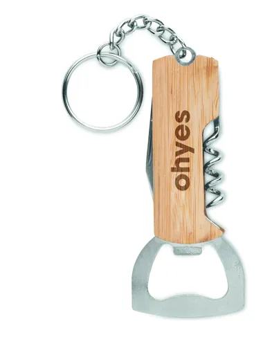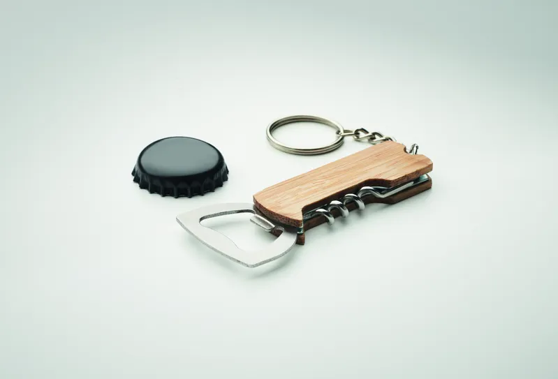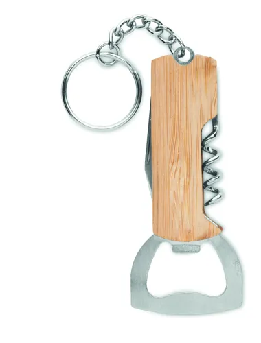 3 az 1-ben zsebkés bambusz markolattal és kulcstartó karikával. Üvegnyitót, dugóhúzót és zsebkést tartalmaz.