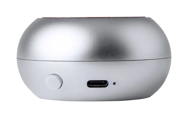 Újrahasznosított alumínium vezeték nélküli hangszóró bambusz hálós résszel és PU bőr hordszíjjal. Beépített újratölthető akkumulátorral. USB töltőkábellel szállítjuk.