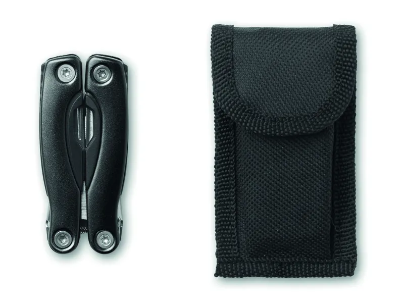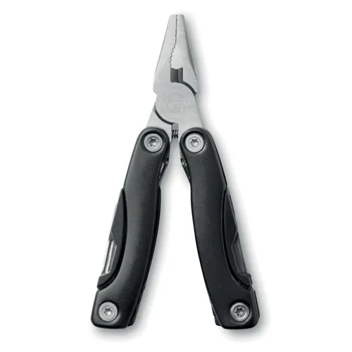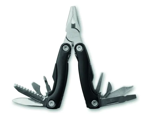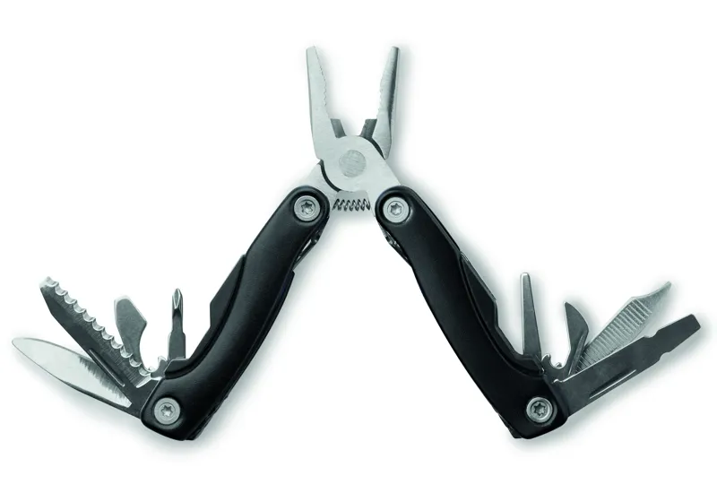 Összecsukható rozsdamentes acél multifunkciós eszköz. Rozsdamentes acél fogóval. 9 funkció. 600D poliészter tokban.