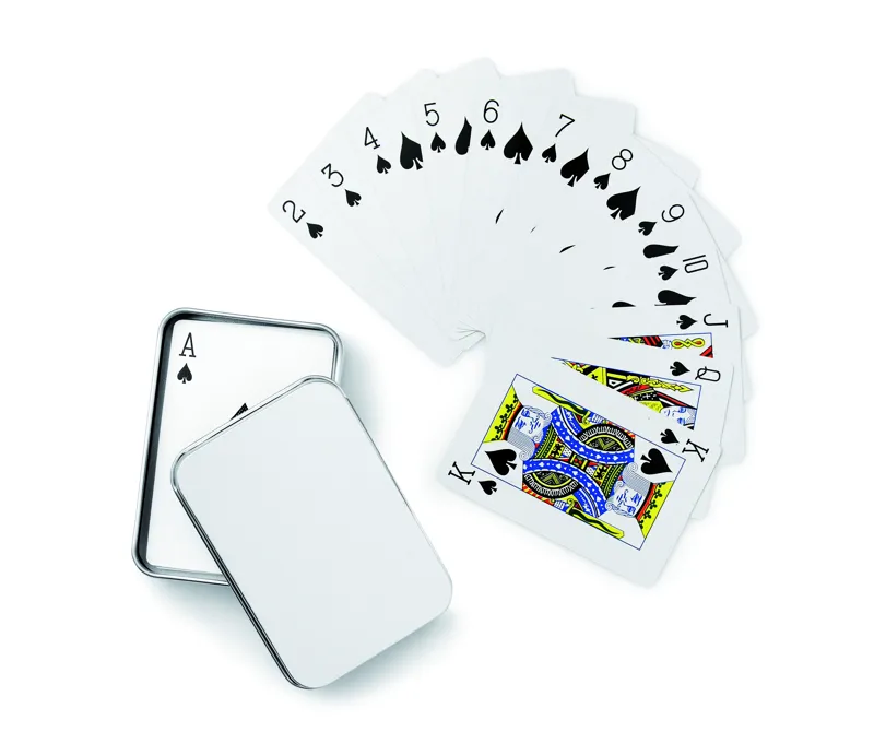 Franciakártya ezüst színű bádogdobozban. 54 kártyalap.