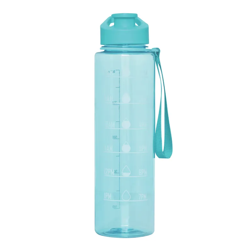 AQUA LEVEL sportkulacs: átlátszó, színes kulacs tartós PETG-ből, színben illeszkedő műanyag csavaros kupakkal, szilikon tömítőgyűrűvel, felhajtható ivócsővel és hordozófogantyúval, motivációs idő- és vízmennyiség-skálával (napszak / ml), csuklópánttal, űrtartalom kb. 1000 ml