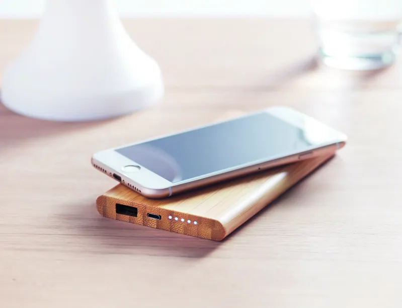 Vezeték nélküli töltő és 6000 mAh külső akkumulátor bambusz házban, C típusú csatlakozóval. A bambusz természetes anyag, színében, mintázatában és méretében esetenként eltérő lehet.