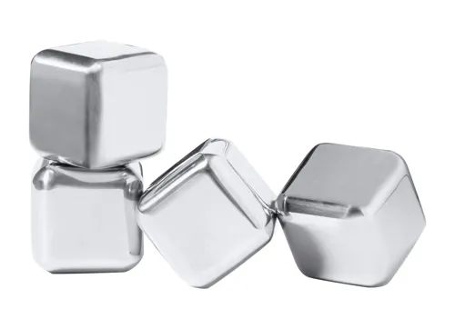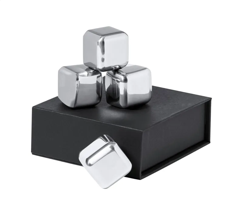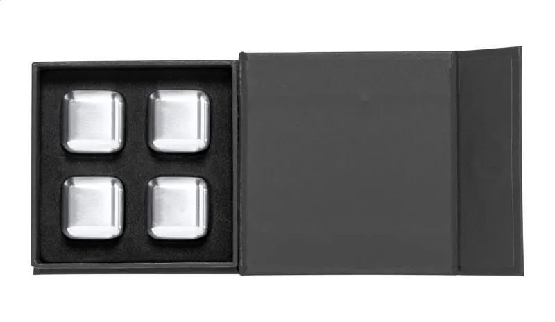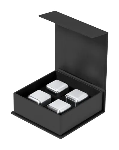 4 db-os újrahasználható, rozsdamentes acél jégkocka szett fekete díszdobozban.