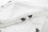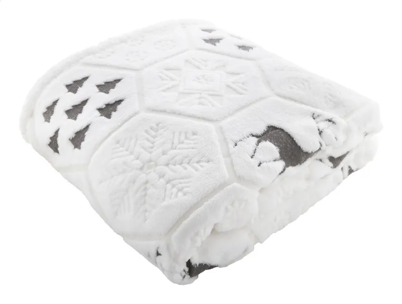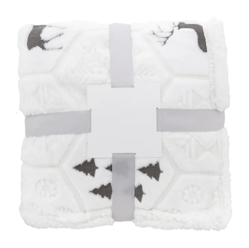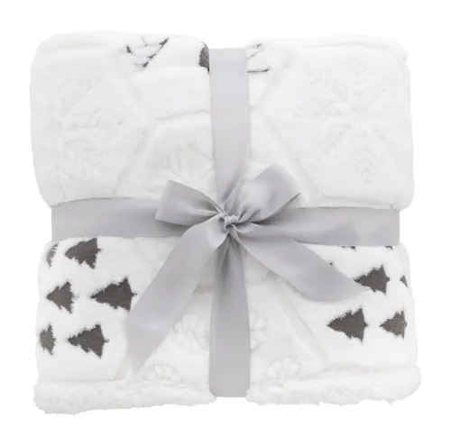 Luxus, kétrétegű RPET karácsonyi takaró dombornyomott téli mintával. 270 g/m² RPET korall polár és megfordítható 210 g/m² RPET sherpa polár béléssel. Szalaggal és nyomtatható papírkártyával csomagolva.