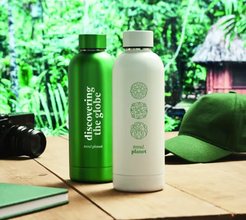 Duplafalú termoszpalack újrahasznosított rozsdamentes acélból (90% újrahasznosított rozsdamentes acél, 10% rozsdamentes acél). Szivárgásmentes. Űrtartalom: 500 ml.