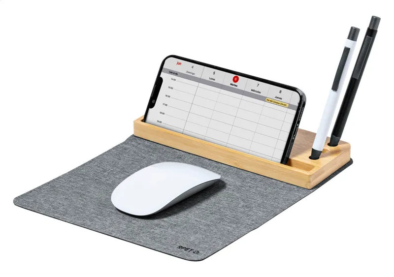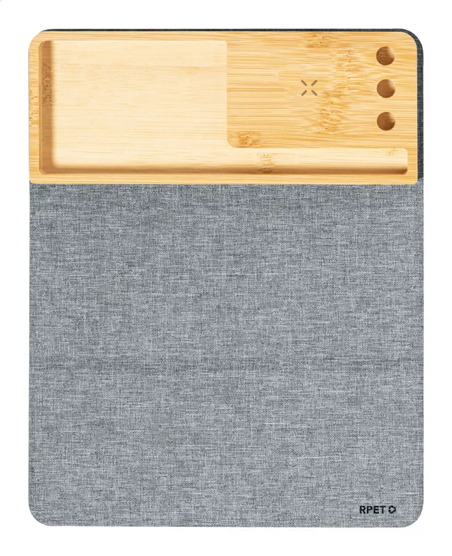 Összecsukható RPET poliészter egérpad szilikon alappal. Beépített vezeték nélküli gyorstöltővel (15W) és bambusz mobiltelefon-tartóval. 300D RPET poliészter. USB töltőkábellel szálíltjuk.