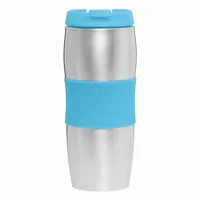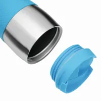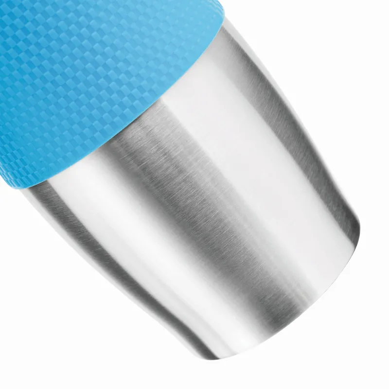 AU LAIT duplafalú termobögre: rozsdamentes acél külső és belső, színes csavaros műanyag fedéllel nyílással az iváshoz, színes műanyag gyűrű a biztosabb és kellemesebb fogás érdekében és gumírozott talp a jó felületi tapadásért, kapacitása kb. 380 ml-es, ajándékdobozban szállítjuk