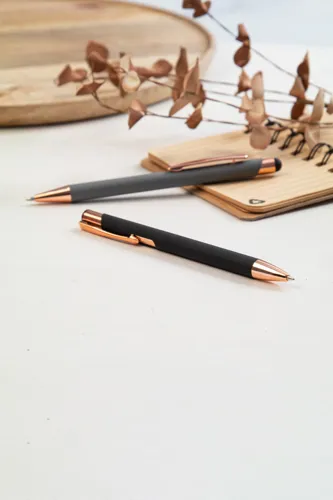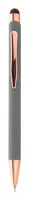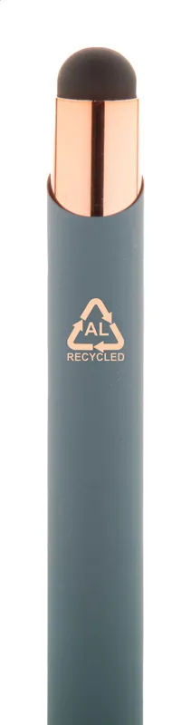 Újrahasznosított alumínium és érintőképernyős golyóstoll gumírozott felülettel és rózsaarany részekkel. Speciális bevonattal rendelkezik a rózsaarany színű tükörgravírozáshoz. Kék tollbetéttel.