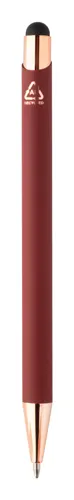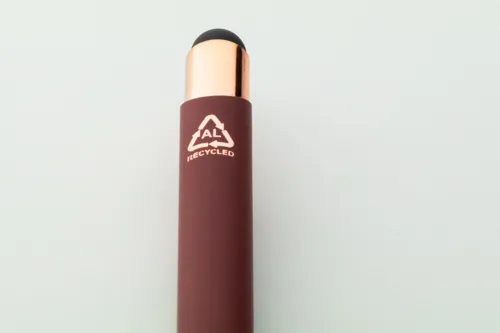 Újrahasznosított alumínium és érintőképernyős golyóstoll gumírozott felülettel és rózsaarany részekkel. Speciális bevonattal rendelkezik a rózsaarany színű tükörgravírozáshoz. Kék tollbetéttel.
