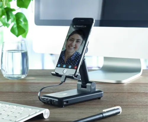 10000 mAh külső akkumulátor ABS-ből, kihúzható és összecsukható telefontartóval. Beépített multi kábelekkel. Teljesítmény: DC 5V/2A.