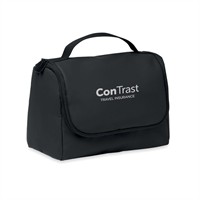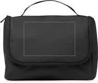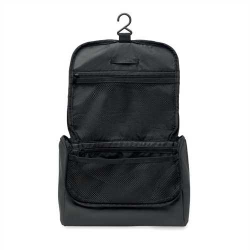 Kozmetikai rendszerező táska puha PU anyagból, akasztóval, 210D RPET béléssel. Egy nagy fő rekesz belső cipzáras hálós rekesszel és 1 hálós rekesszel.